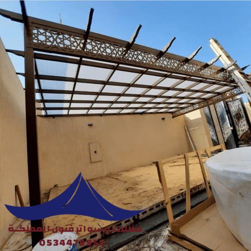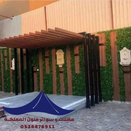 يتم تركيبها من تيوبات حديد بجنب بعض وتعطي منظر جميل ويتم رش الحديد بأجود انواع الدهانات الألمانية ذات اللون الخشبي وتوجد عدة انواع من مظلات وجلسات مودرن يوجد انواع خشبي مصنوع من افضل الأخشاب الماليزية المستودة وتتميز بمنظرها الرائع ولونها الهادئ الجذاب